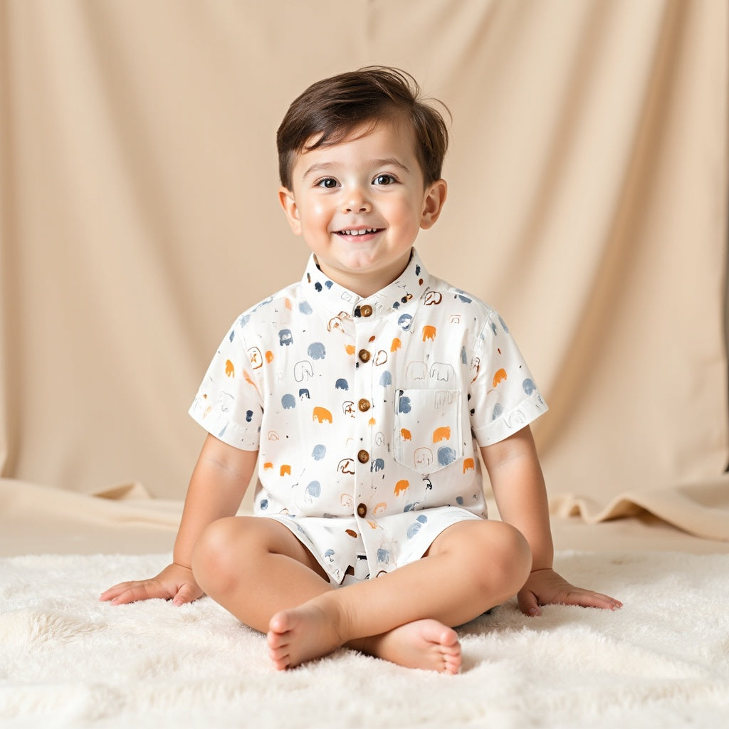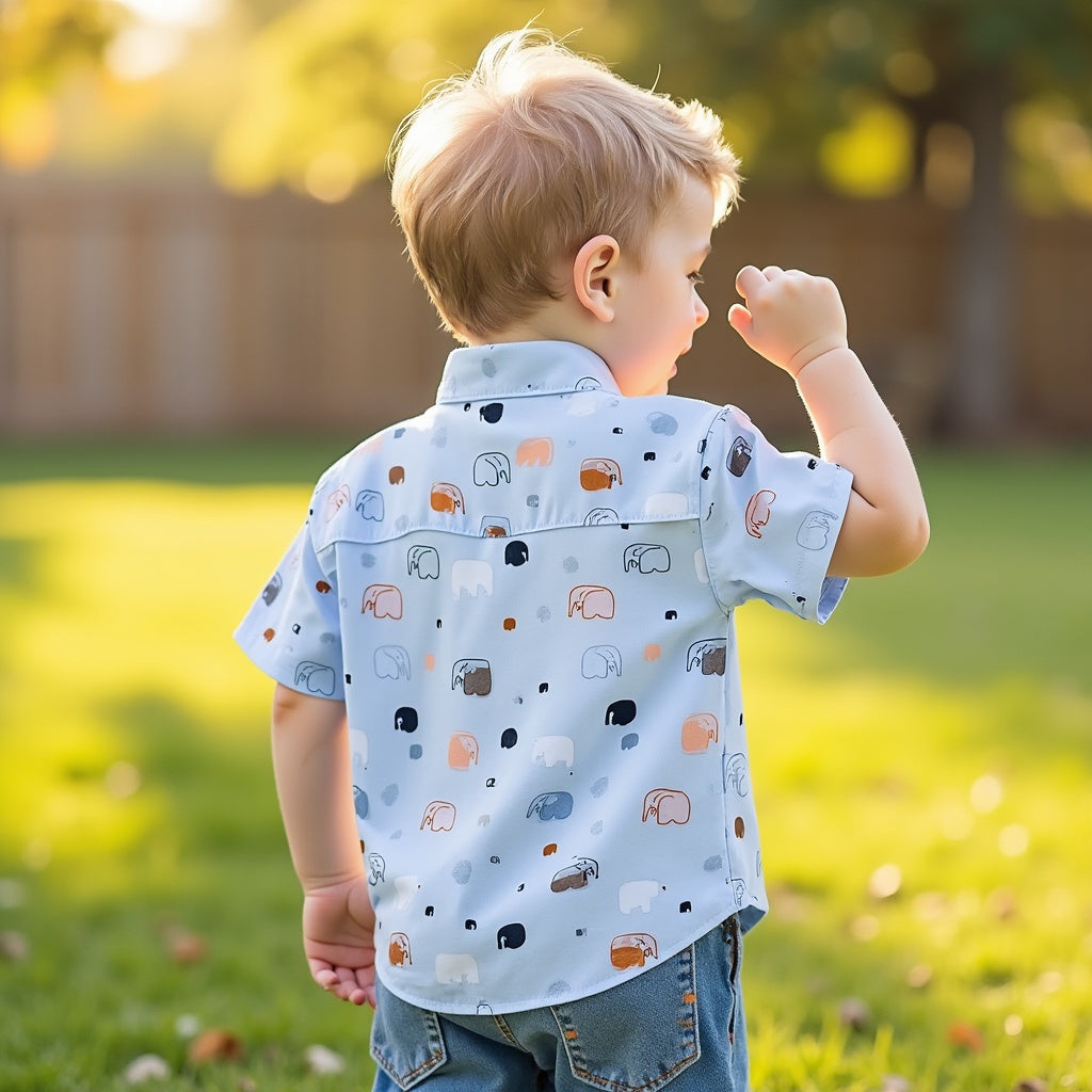 Let your little one shine in this adorable elephant print shirt! Crafted with soft, breathable fabric, this short-sleeve shirt is perfect for everyday wear, playdates, or special occasions. The playful elephant design adds a fun touch, while the button-up front and relaxed fit ensure comfort throughout the day. Whether paired with shorts or jeans, this shirt is sure to become a wardrobe favorite.