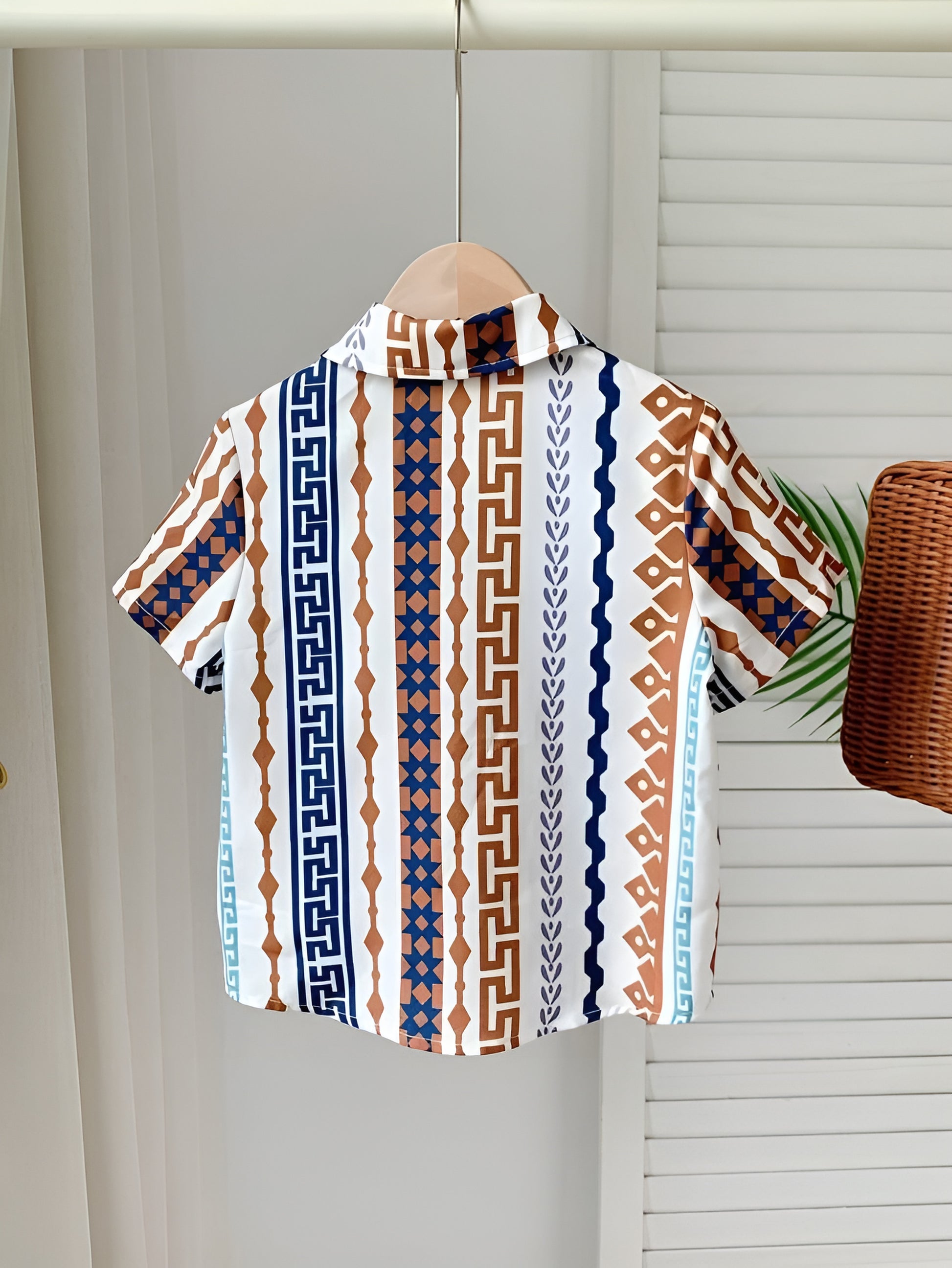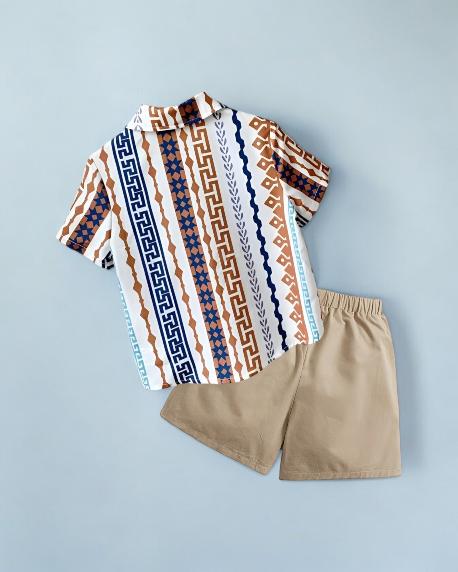 Boy Brown Chain Geomatric Striped Short Sleeve Shirt & Shorts Two Piece Clothing Set