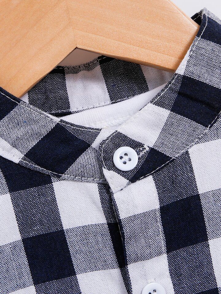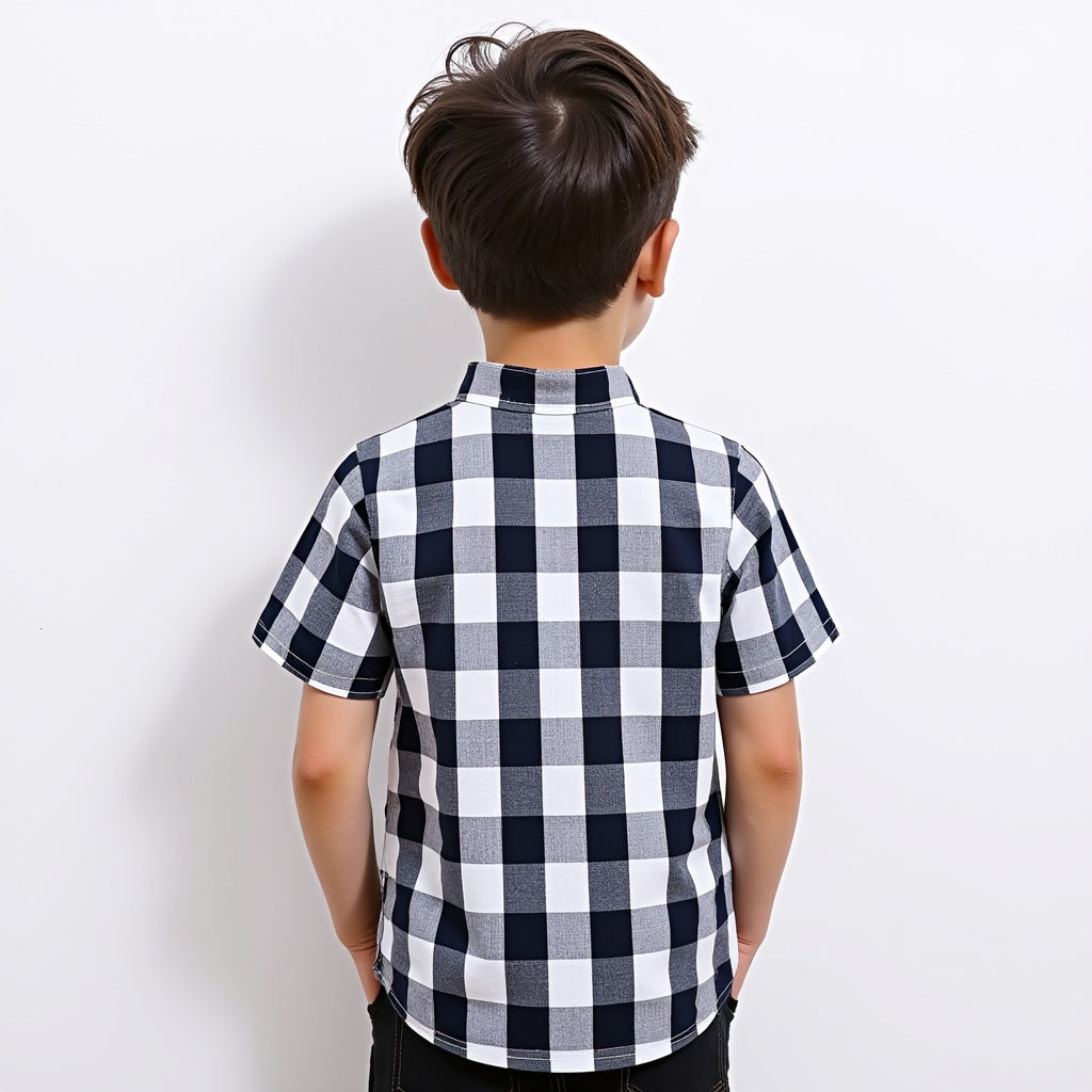 This is a kids' short-sleeve shirt featuring a classic black-and-white checkered pattern. It has a traditional collar, a button-up front with white buttons, and a matching chest pocket with diagonal checks, adding a stylish touch to the design. The cotton fabric ensures comfort, making it suitable for casual outings or semi-formal occasions. The timeless checkered style adds versatility and elegance to a child’s wardrobe.