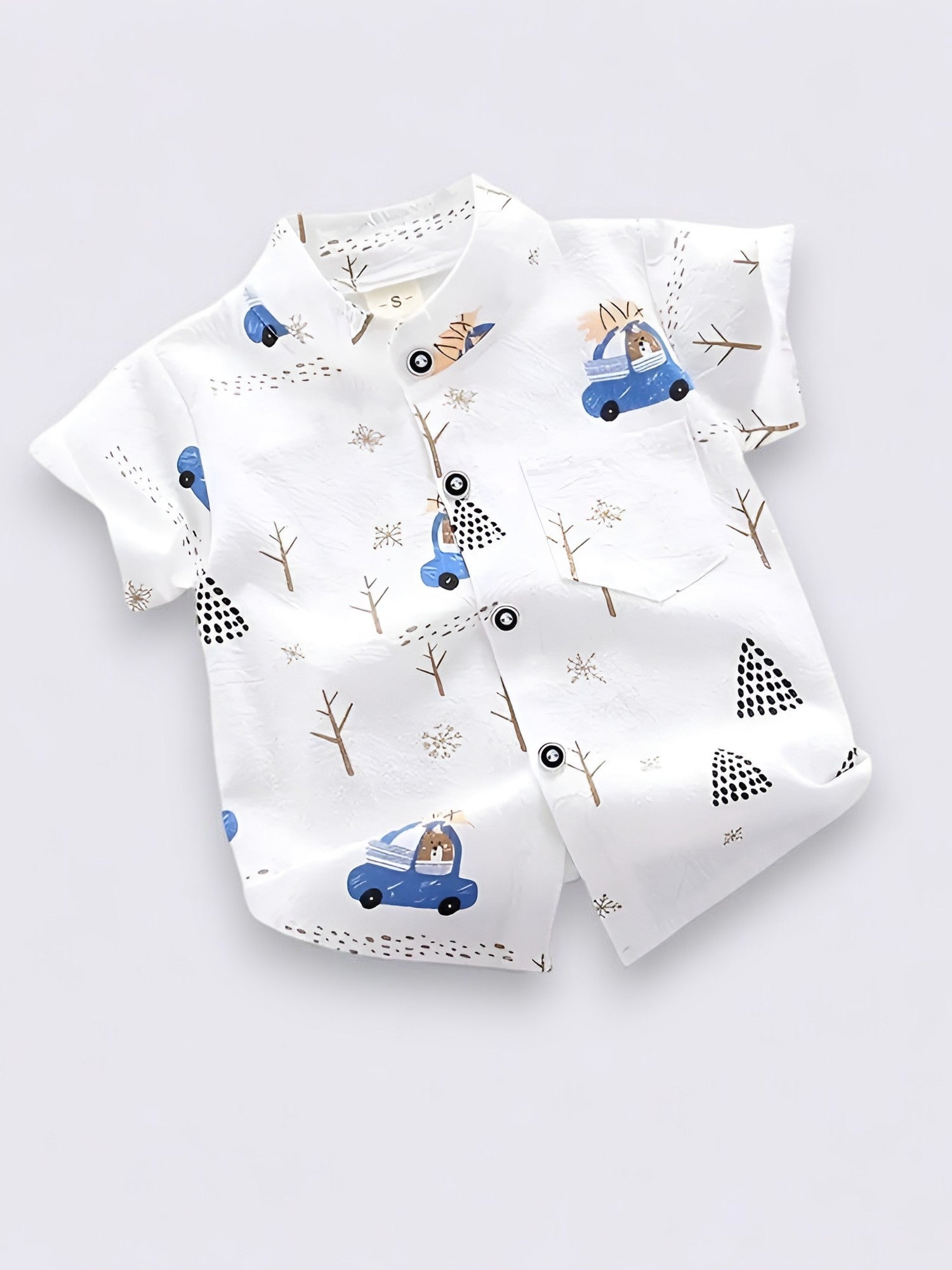 - White Car Print Shirt with Mandarin Collar – Featuring adorable blue cars and trees, this classy design adds a playful punch to any casual or semi-formal occasion.