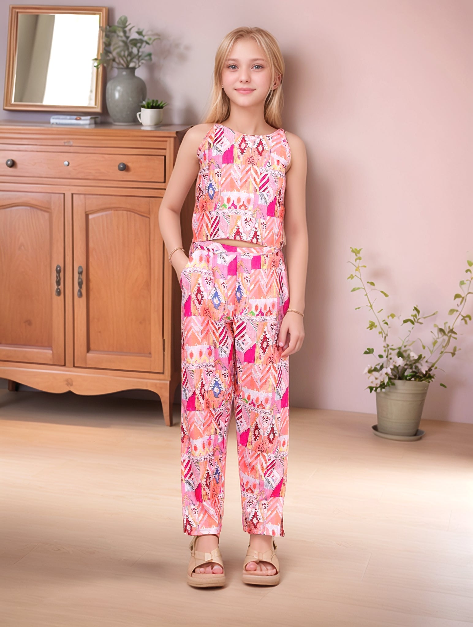 Elevate your little one's wardrobe with this stylish 3-piece co-ord set, designed for fashion-forward girls. Featuring a vibrant multicolor print, this set includes a crop top, high-waisted pants, and a matching jacket for a complete and trendy look. Crafted from soft, breathable fabric, this outfit ensures all-day comfort while keeping your child effortlessly chic. Perfect for casual outings, parties, and festive occasions.