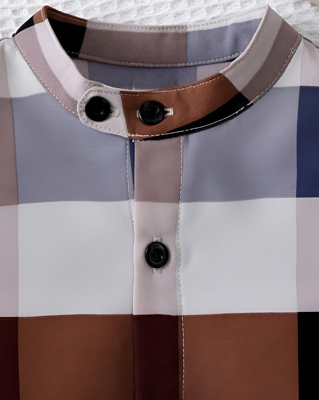 Add a touch of style to your little one's wardrobe with this classic boys' outfit set. Featuring a short-sleeve button-down shirt in a bold multicolor plaid pattern and comfortable khaki shorts with an elastic waistband, this ensemble combines both fashion and ease. Perfect for casual outings or special occasions, this set offers a sharp and trendy look for boys. Available in multiple sizes at Shinydots.