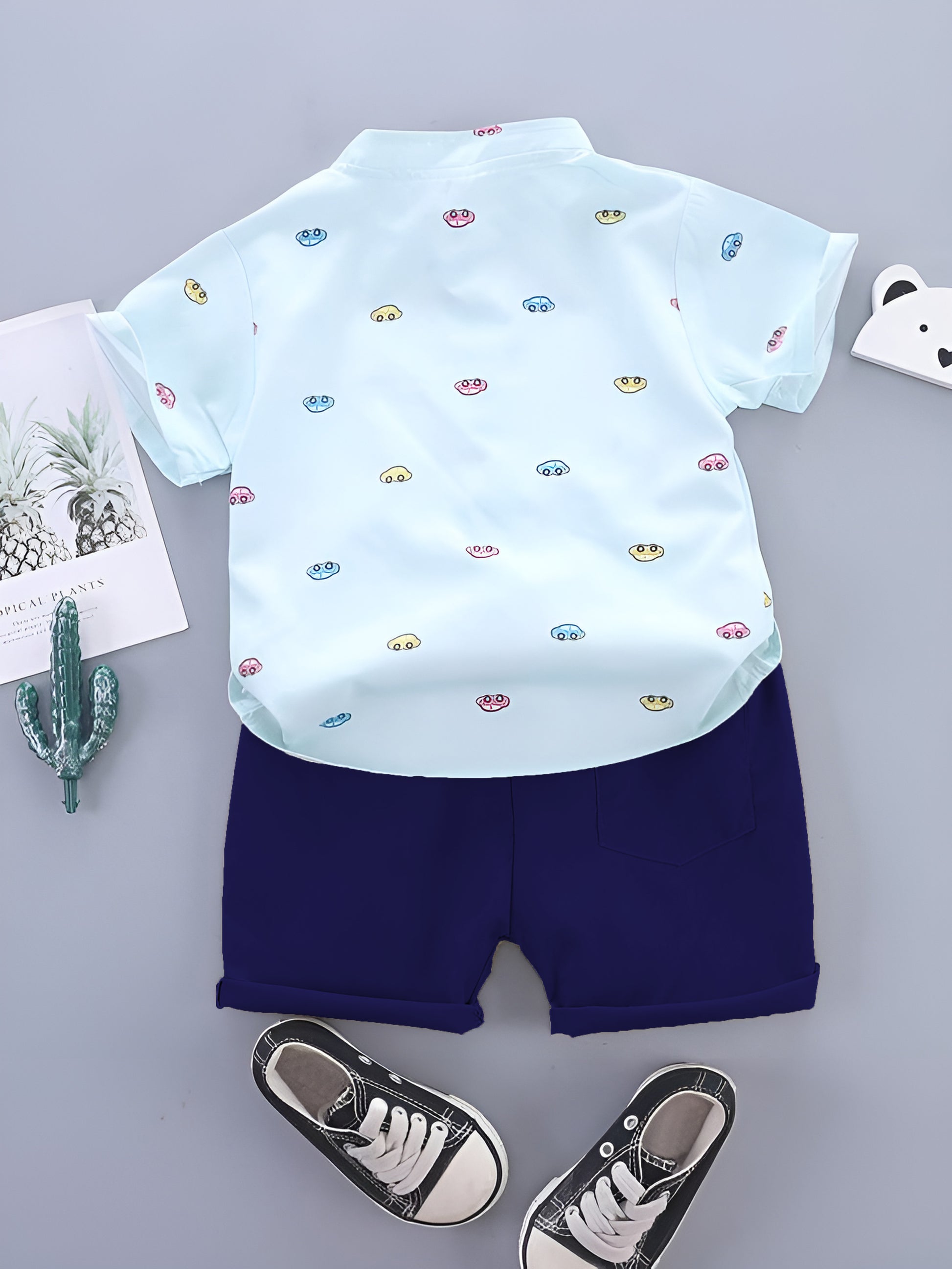 - Color: Sky Blue Shirt with Multi-Color Car Prints with Navy Blue Shorts
