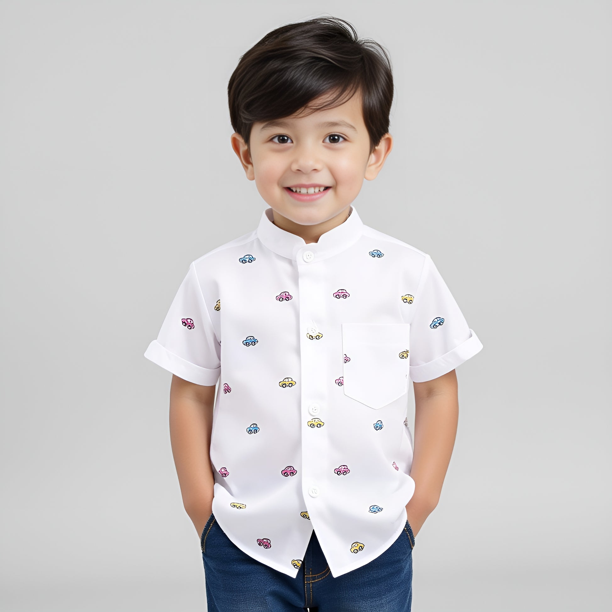 White Shirt with Colorful Car Print & Mandarin Collar – A fresh favorite with tiny cars scattered across soft white fabric, ideal for daily wear.